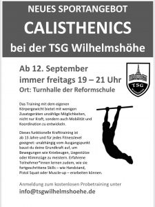 Nun haben wir endlich ein neues Sportangebot für euch! Ab dem 12.September wird es jeden Freitagabend ein zweistündiges Calisthenics-Angebot in der Halle der Reformschule geben! Wir freuen uns sehr euch allen diese neue Möglichkeit zu bieten! Alle Infos findet ihr auf dem unten stehenden Flyer! PrevNext